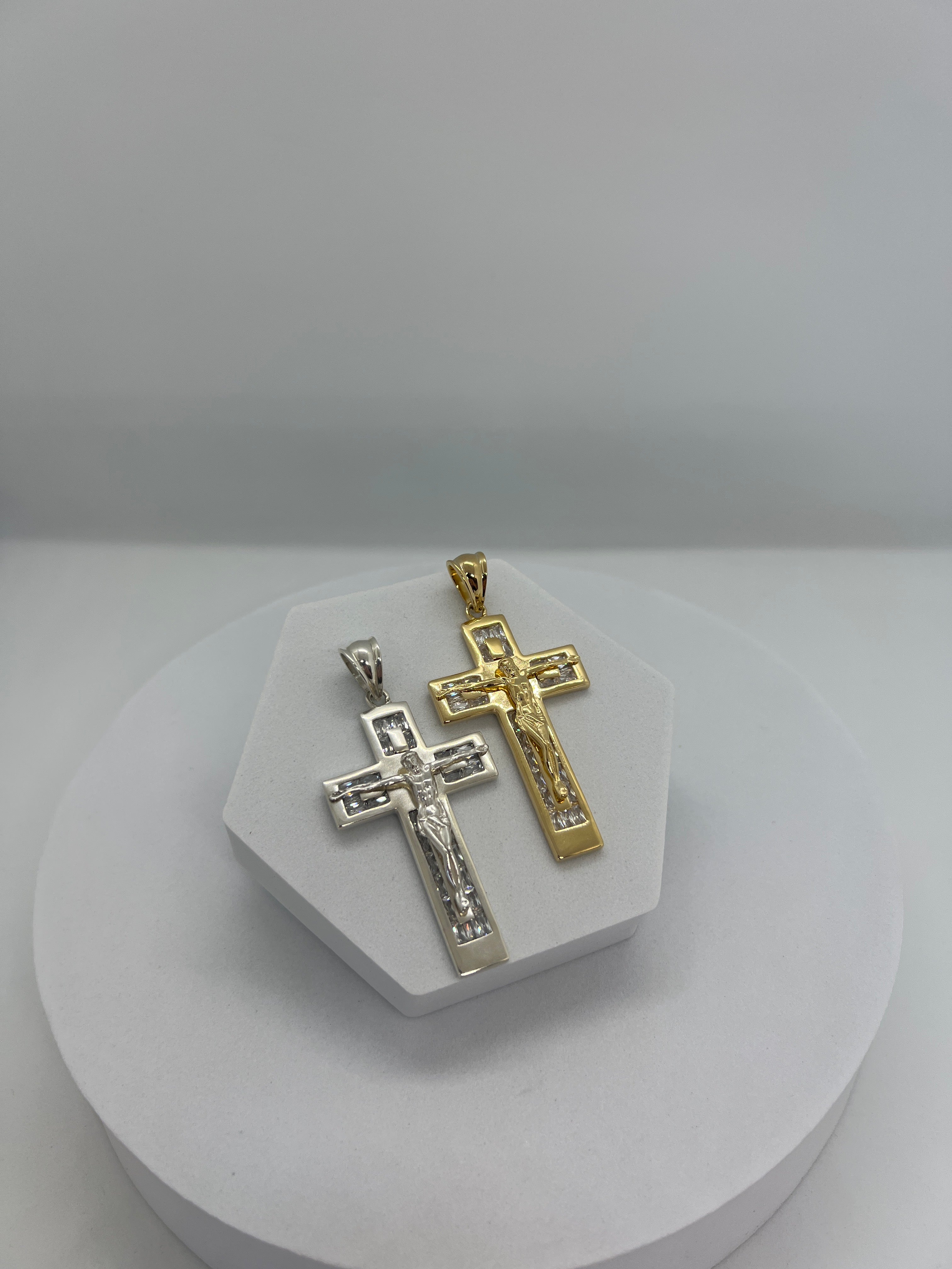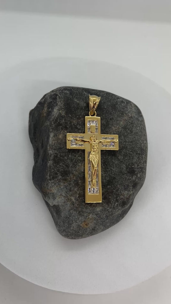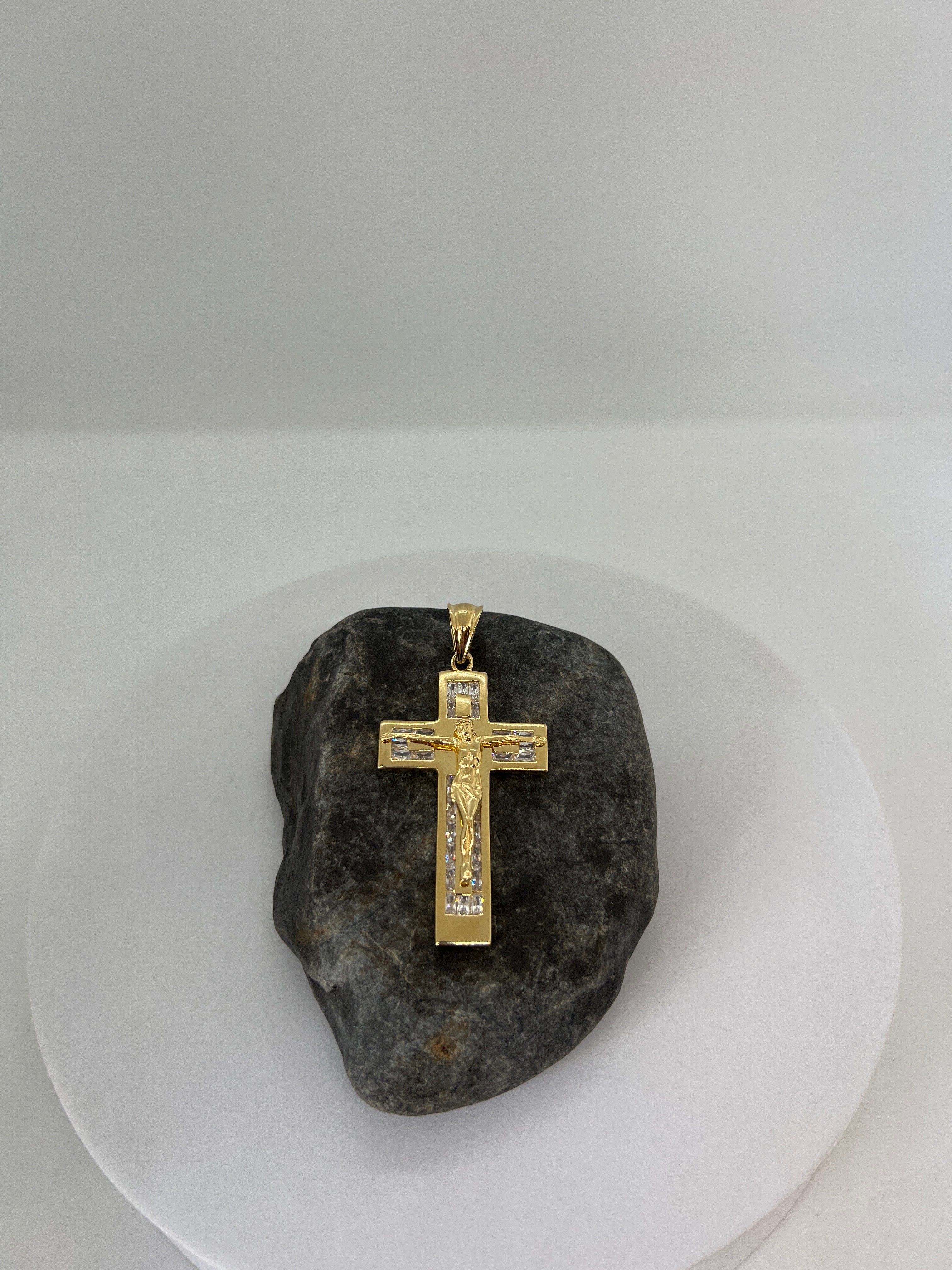 Sterling Silver Yellow Gold Plated Cubic Zirconia Baguette Crucifix Pendant