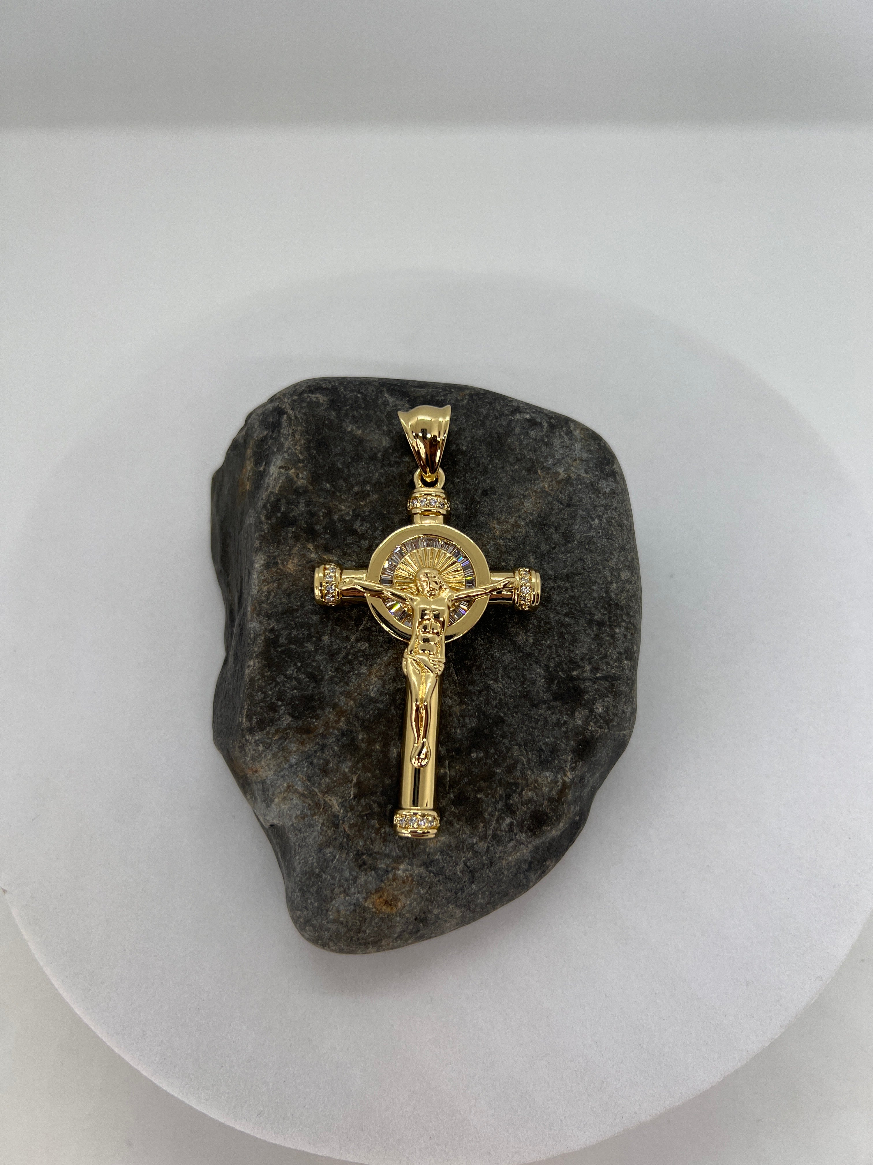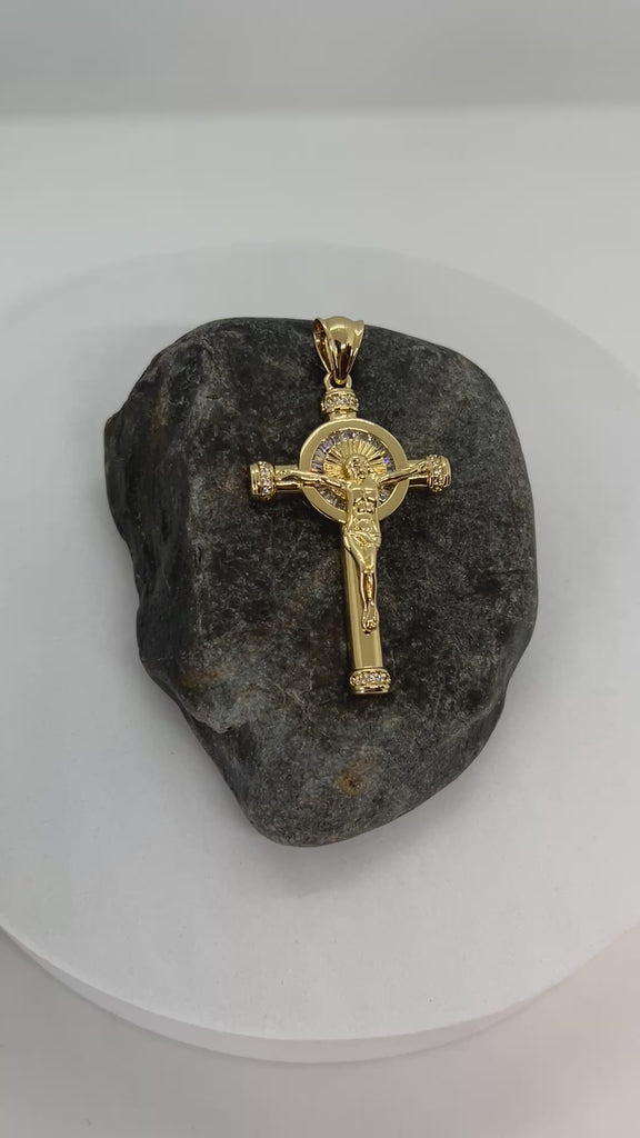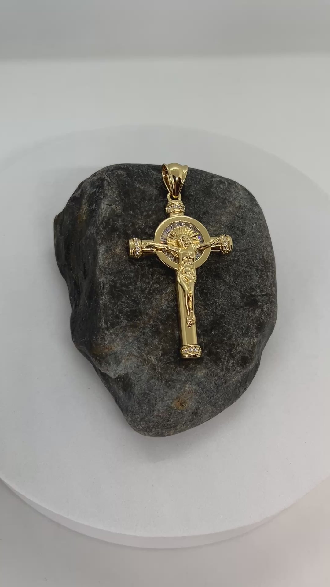 This Sterling Silver Gold Plated CZ Crucifix Pendant combines high-quality sterling silver with a luxurious gold plating for lasting shine and durability. The pendant features expertly set cubic zirconia stones that add a subtle yet sophisticated sparkle, enhancing its classic crucifix design. Perfect for those seeking a meaningful and elegant accessory, this pendant offers both timeless symbolism and refined craftsmanship suitable for any occasion. Style #VP171