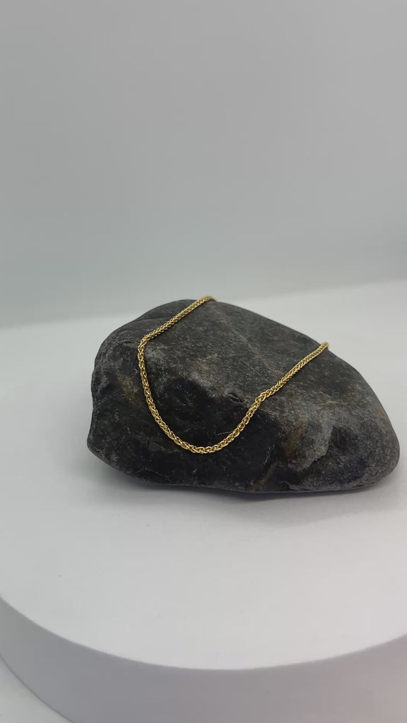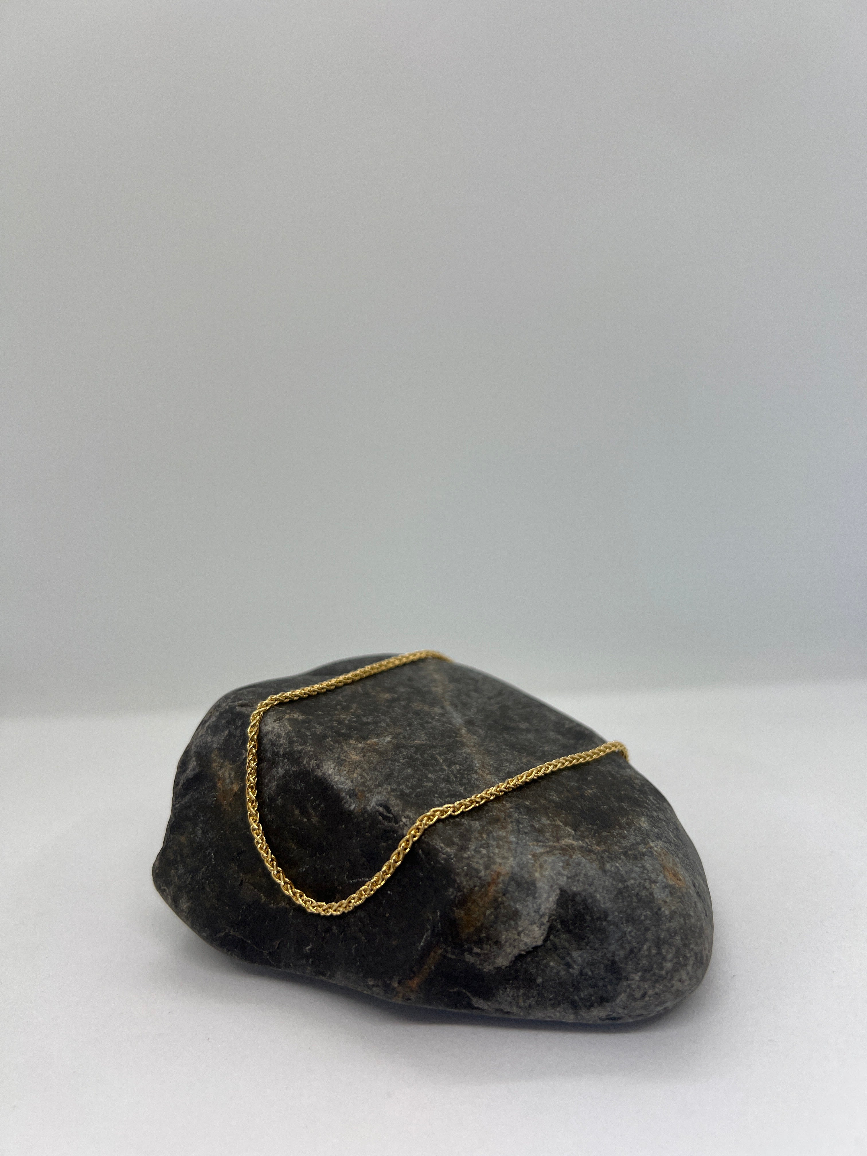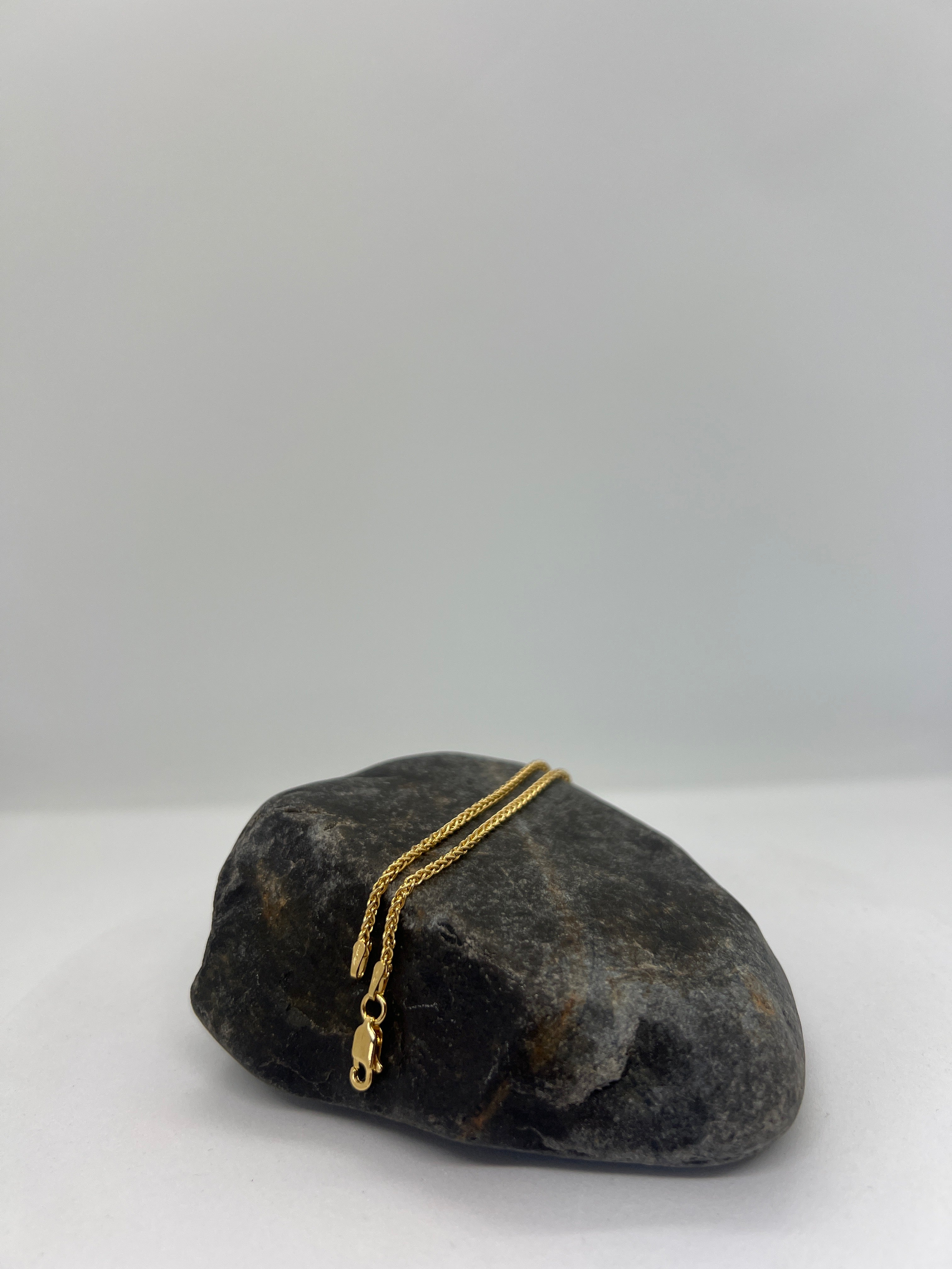 Imported from Italy since 1976, this Sterling Silver Wheat Chain features a 1.5mm width with signature yellow gold plating for lasting elegance. Known as Spiga in Italian, its flexible and sturdy design offers a refined alternative to traditional rope chains. Available in lengths from 16" to 30", each chain includes a secure lobster claw clasp for reliable wear. Weights range from 5.00g to 9.10g depending on length, ensuring a balanced feel and durability for everyday or layered styling.