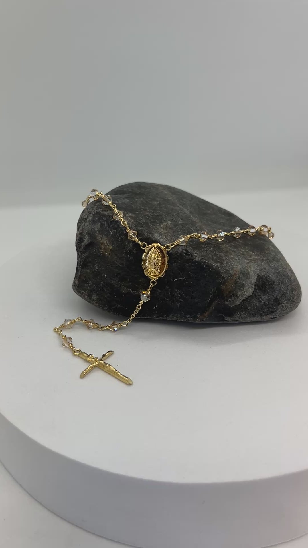 This 24-inch rosary is crafted from sterling silver with a yellow gold plating, featuring golden crystal beads that provide a luminous accent. Designed with precision, it offers both durability and elegance, making it suitable for devotional use or as a meaningful gift. Its classic style and high-quality materials ensure a lasting symbol of faith.