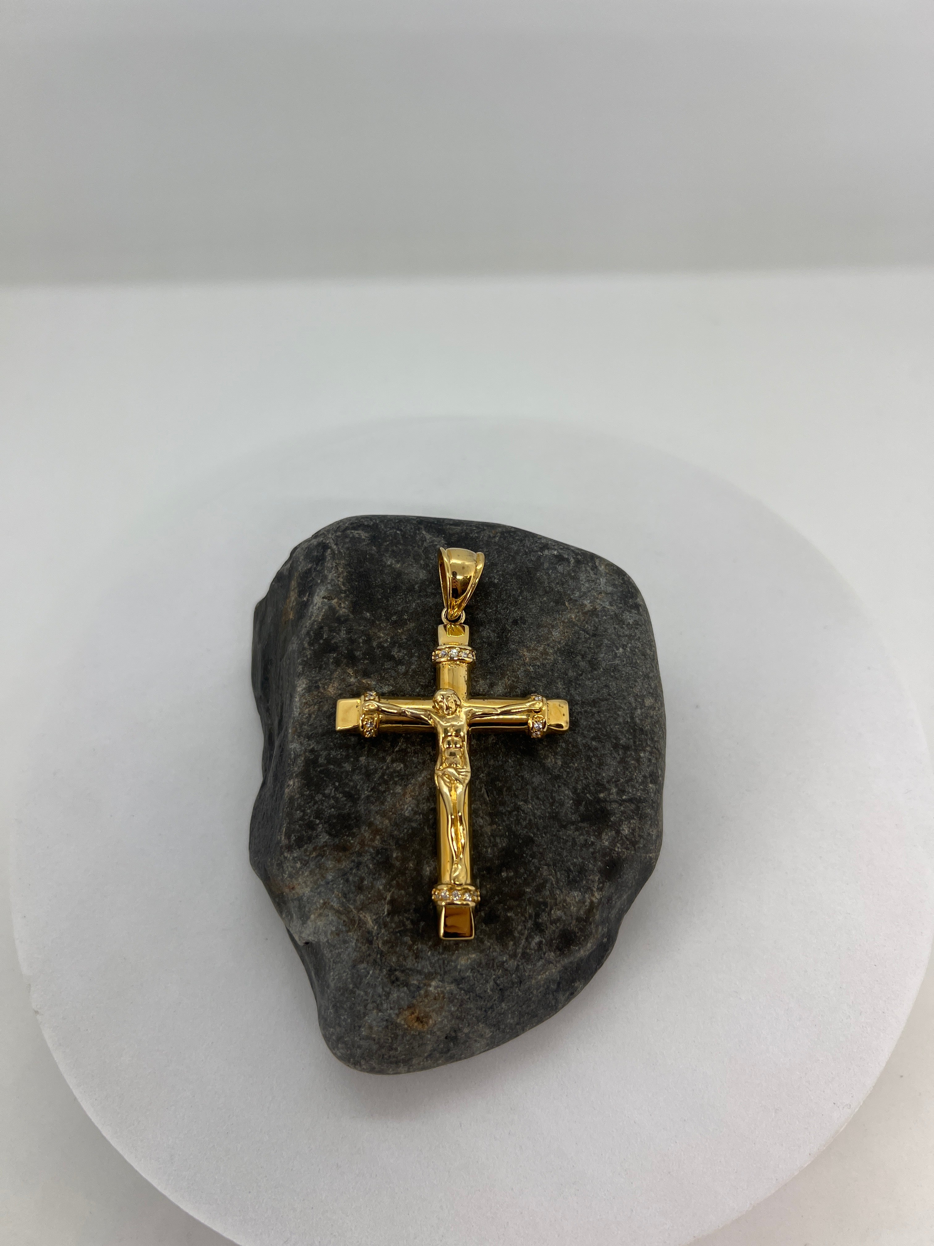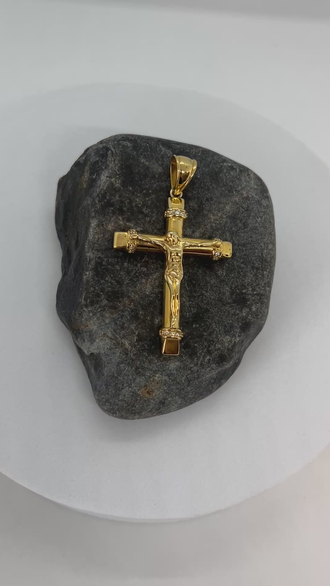 This Sterling Silver Yellow Gold Plated Silver CZ Crucifix features a durable sterling silver base with a warm yellow gold plating that enhances its classic appeal. The crucifix is adorned with precisely set cubic zirconia stones, adding a subtle brilliance that highlights its detailed craftsmanship. Expertly designed, this piece offers meaningful symbolism combined with refined elegance, making it suitable for everyday wear or special occasions.