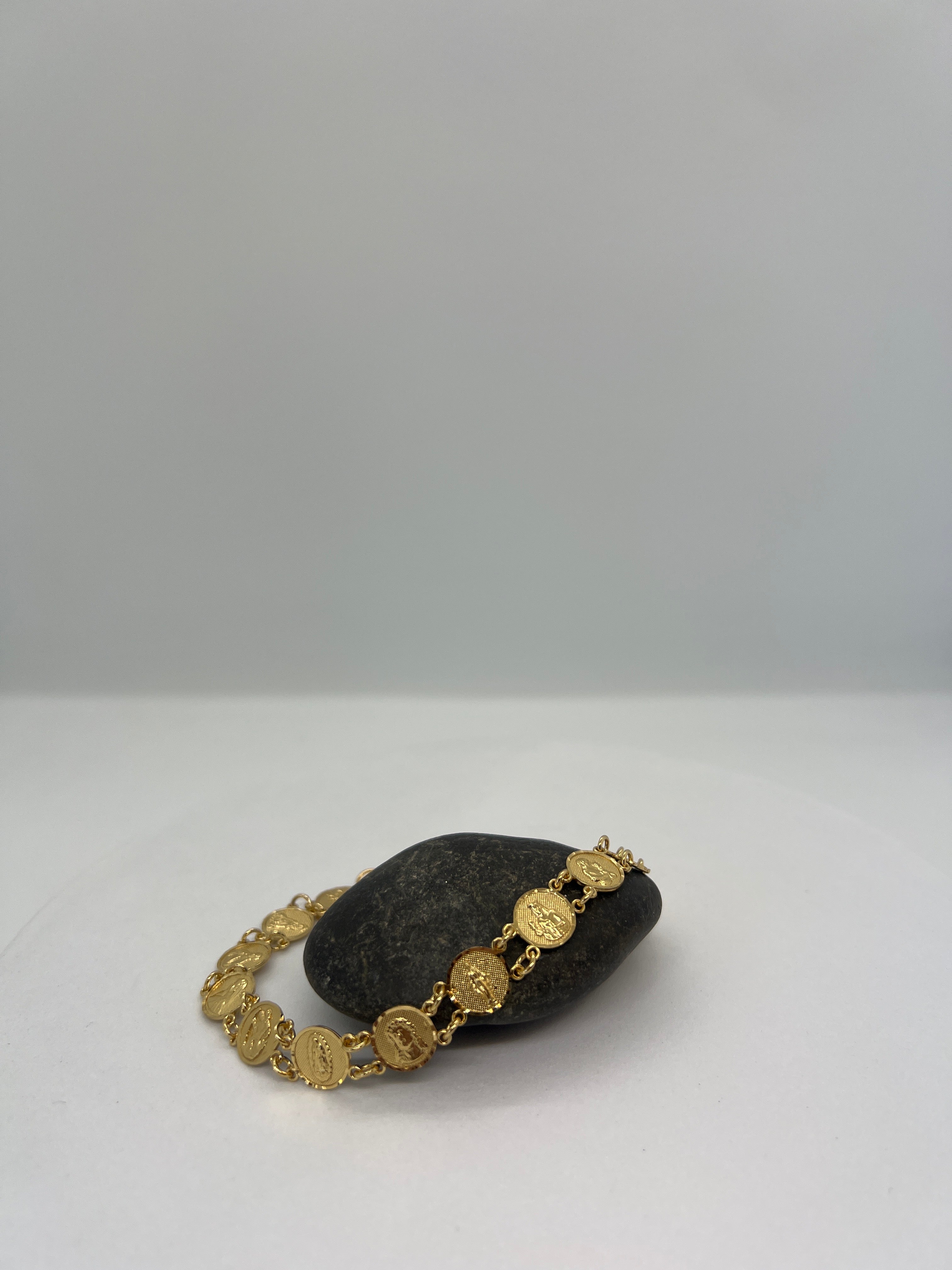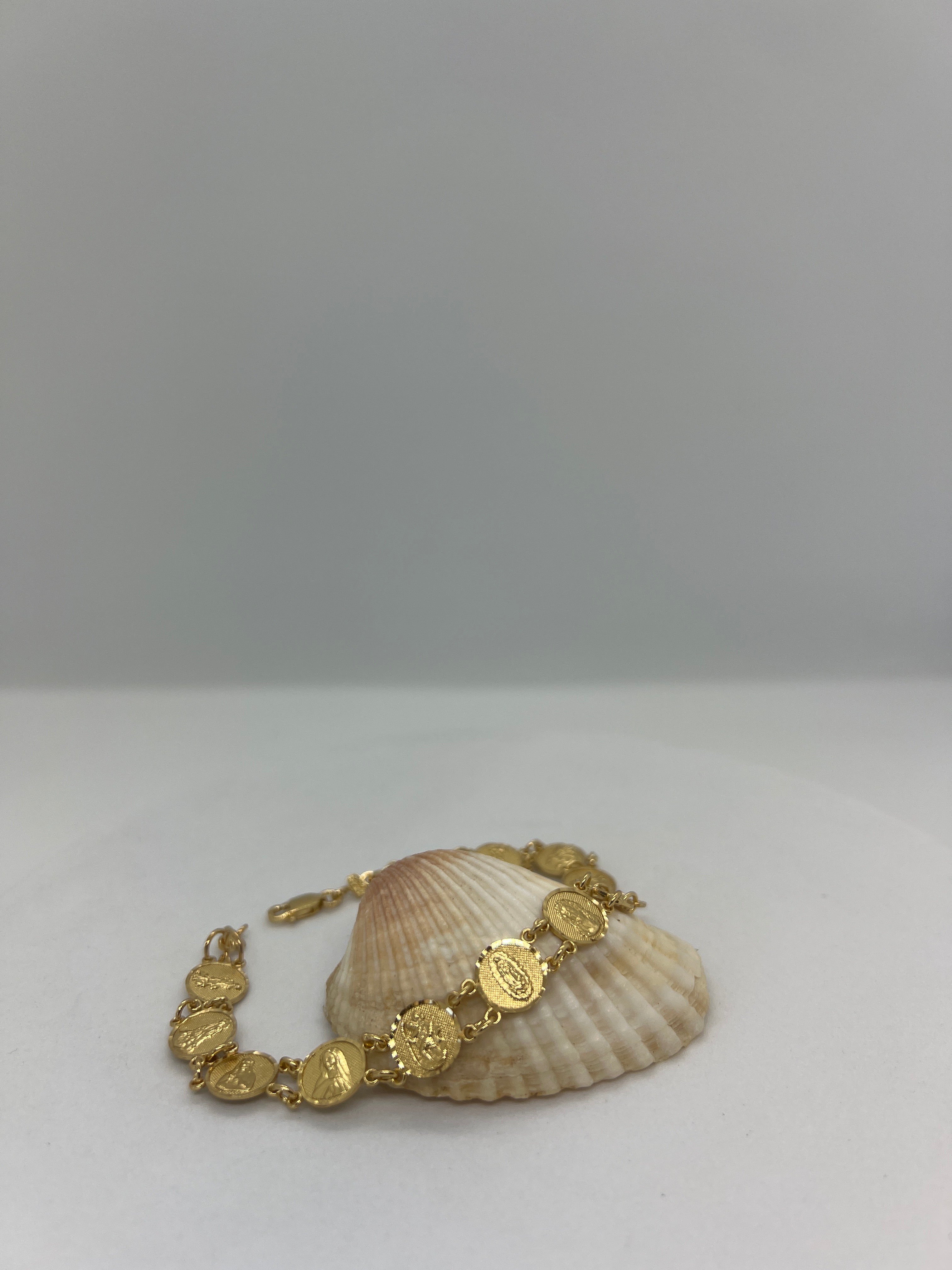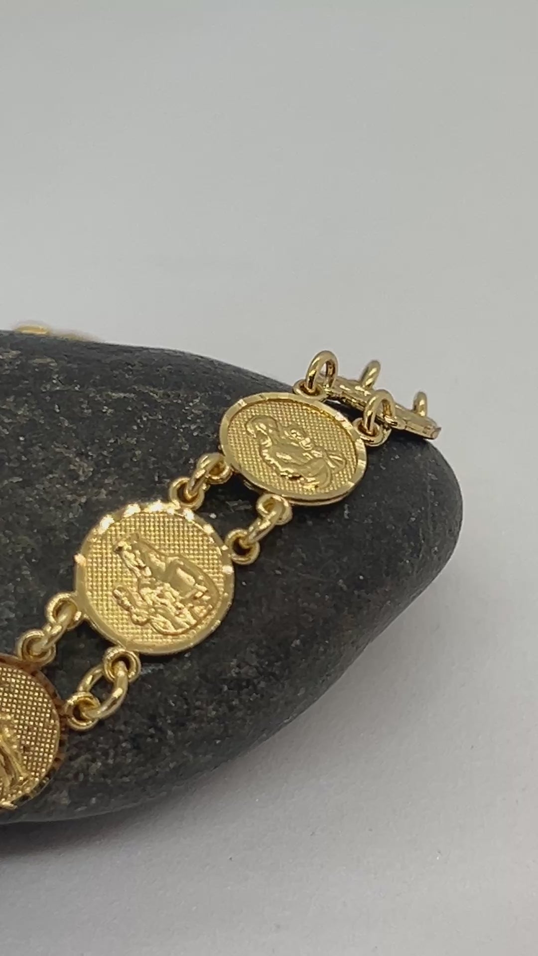 This sterling silver bracelet, plated with yellow gold, combines lasting durability with a luminous finish. Adjustable between 7 and 9 inches, it accommodates a wide range of wrist sizes comfortably. Featuring intricately crafted saint motifs, this bracelet offers both a refined aesthetic and a profound expression of faith, making it ideal for daily wear or special occasions. Style # SB4464