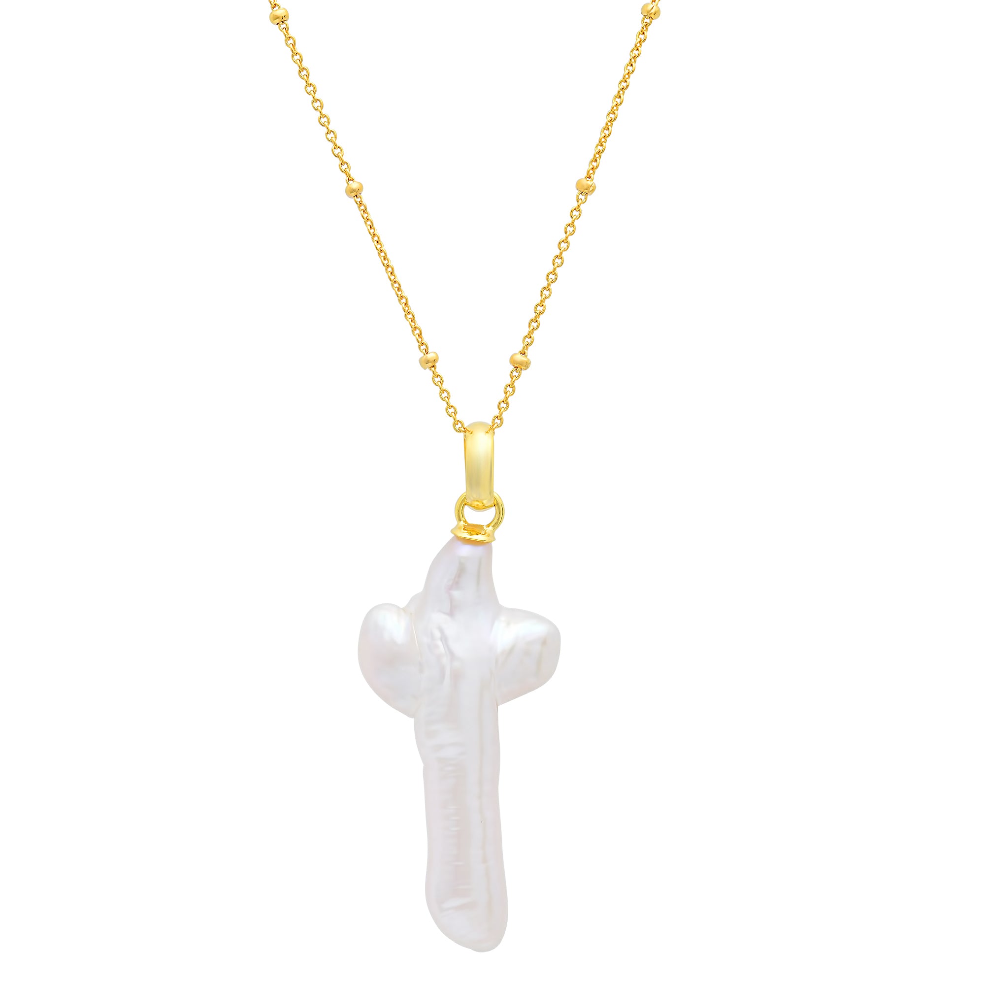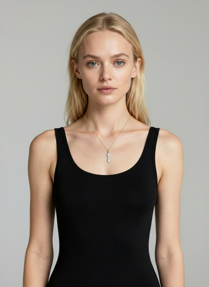 Handcrafted in Portugal from solid .925 sterling silver and finished in rich gold plating, this piece features a cross crafted entirely from genuine Mother of Pearl. Each Pearl is inherently unique offering a special distinctiveness making it that much more special. Its natural iridescence adds depth and quiet brilliance, merging timeless symbolism with a refined, modern finish.