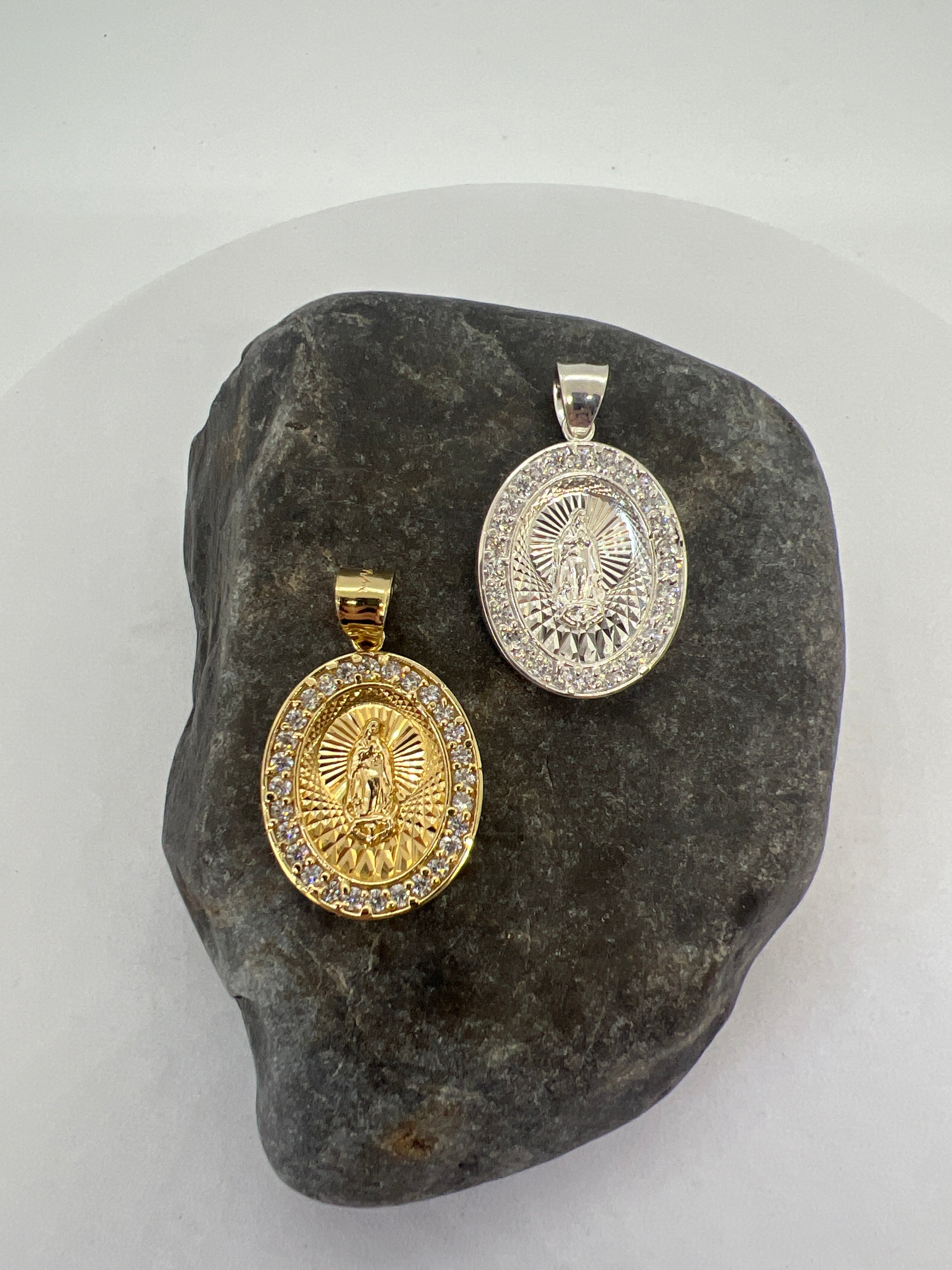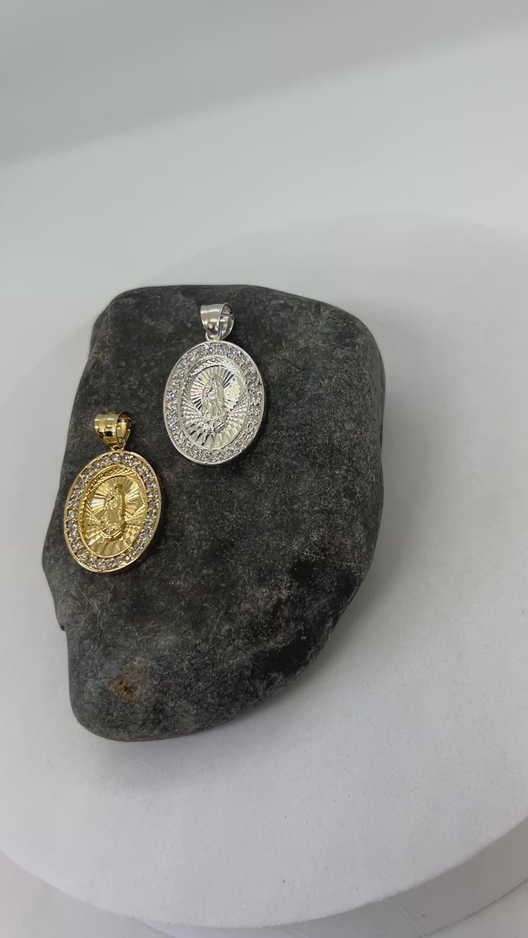 This oval-shaped Our Lady of Guadalupe medal pendant is crafted from genuine sterling silver and coated with a rich yellow gold plating for enduring elegance. It is embellished with round cubic zirconia stones that provide a distinctive sparkle, highlighting the intricate craftsmanship. Skillfully made, this pendant blends meaningful symbolism with refined design, making it suitable for everyday wear or special occasions.