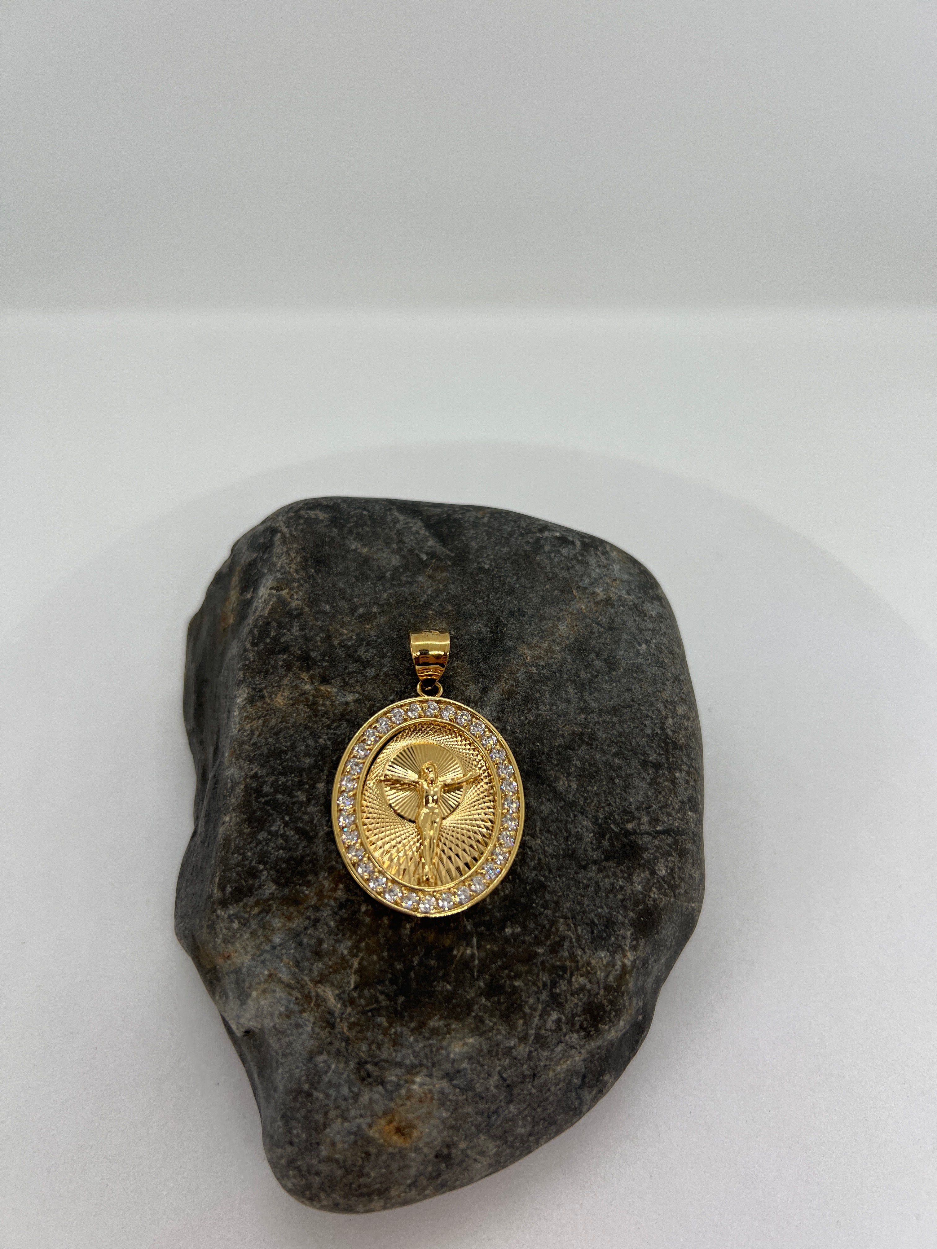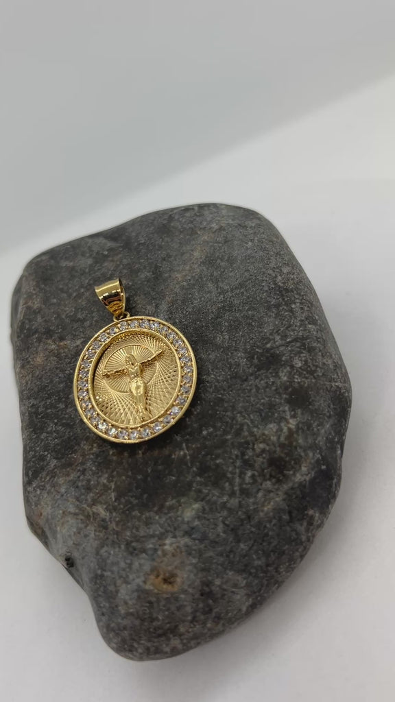 This oval-shaped crucifix medal pendant is crafted from genuine sterling silver and coated with a rich yellow gold plating for enduring elegance. It is embellished with round cubic zirconia stones that provide a distinctive sparkle, highlighting the intricate craftsmanship. Skillfully made, this pendant blends meaningful symbolism with refined design, making it suitable for everyday wear or special occasions.