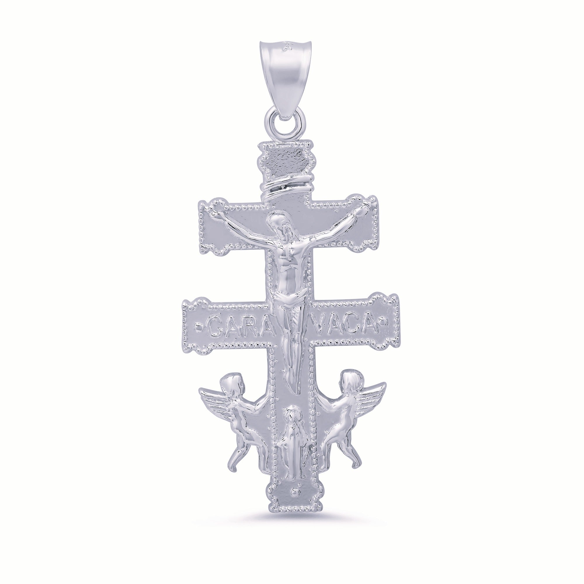 In Cara Vaca, Spain, a priest imprisoned by the Moors was asked to say mass but lacked a cross. According to legend, two angels miraculously brought him the Pectoral Cross of the Patriarch of Jerusalem. This style of cross was then introduced and popularized in Mexico by the Spanish. This sterling silver crucifix pendant, available with your choice of our Signature Gold or Platinum plating, is meticulously crafted to represent a timeless symbol that combines strength with elegant design. Ideal for personal devotion or as a thoughtful gift, it offers a distinguished way to express faith with lasting sophistication.